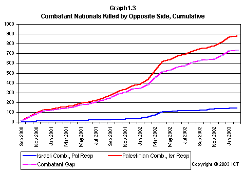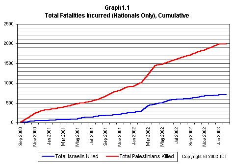 NEW! We now also offer an up-to-date Israeli/Palestinian Conflict Statistics page with the latest totals from our database, as well as a full database query function for viewing "Intifada" incidents and casualty data. You can access all these features through ICT's Arab-Israeli Conflict Page.
