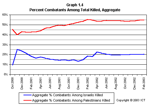 The pronounced increase over time in the percentage of combatants among Palestinian fatalities appears to result from a combination of several possible factors: