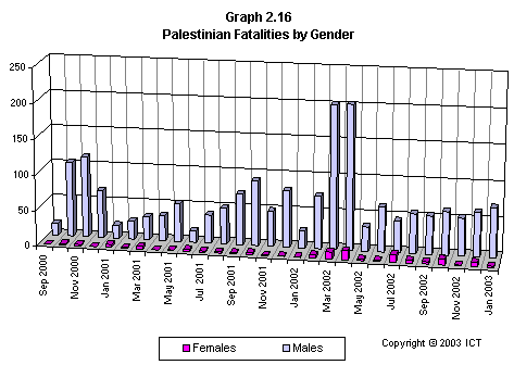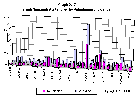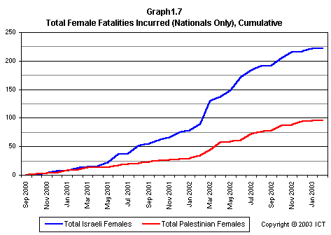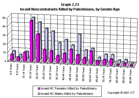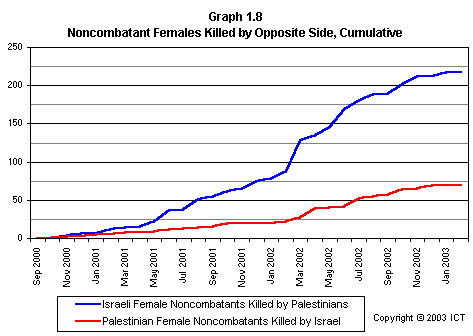 Graph 2.19 reveals a related fact that has received scant media attention: If we look only at females killed, Israeli fatalities have far outnumbered Palestinian fatalities. This graph includes only each side's noncombatant females killed by the opposite side; but even if we include Palestinian combatant females and others whose death is not reliably attributable to Israeli actions, the ratio of Israeli females killed to Palestinian females killed is 2.7 to 1. (Using the more stringent criteria of noncombatants killed by the opposite side, the ratio is 3.6 to one.)