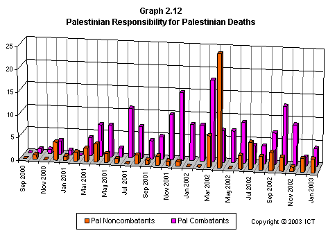 Graph 2.12 shows the trend in Palestinian fatalities caused by Palestinian actions – including suicide bombings, “work accidents”, internecine struggles, and so on.