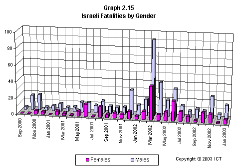 Graph 2.15 shows Israeli fatalities month by month, with male victims separated from female victims. While there is an overall preponderance of male Israelis killed (slightly over two thirds of the victims were male), the pattern is not consistent – there were some months when females outnumbered males among the victims – or extreme. As will be seen below in the section dealing with Age Distribution, the “excess” of males is not consistent across ages; fatalities among young people and the elderly are evenly balanced between the sexes.