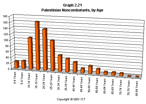 Graph 2.21, on the other hand, showing Palestinian noncombatant fatalities of both sexes (which, as we’ve seen before, consist almost entirely of males), displays a highly non-random age distribution.