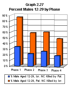 One frequently-used measure of the extent to which noncombatant fatalities represent “genuinely innocent victims” is the proportion of young males among them. A very high proportion of young males is taken to indicate that many of the fatalities likely resulted from confrontations that the victims could have avoided. Graph 2.27 shows that for the first three phases of the conflict, the proportion of Palestinian noncombatants killed by Israel who fit into this category was significantly higher than the proportion among Israelis – especially so during Phase 1, when 85% of the Palestinian noncombatants killed by Israel were males aged between 12 and 29. Since the beginning of the conflict, 63% of all Palestinian noncombatants killed by Israeli forces have been in this category; this compares with 26% of all Israeli noncombatants killed by Palestinians.