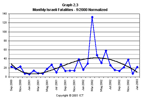 The preponderance of noncombatant over combatant casualties is immediately obvious. The irregular but generally increasing trend in Israeli noncombatant fatalities is also apparent, along with the gradual increase in Israeli combatant fatalities since the beginning of 2002, leading up to the substantial losses suffered during Operation Protective Shield. (Note also December 2001, which included several major Palestinian terrorist attacks perpetrated during American envoy Anthony Zinni’s visit to the area.) As we saw above, the extremely high number of Israeli noncombatants killed in March 2002 "flattens" the rest of the graph, making the overall increasing trend appear less significant than it otherwise would.