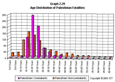Graph 2.28 displays all Israeli fatalities by age, with combatants separated from noncombatants.