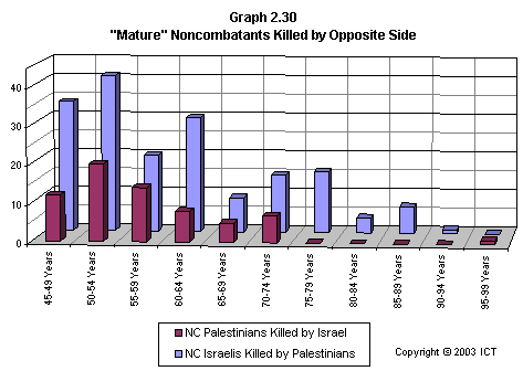 What is significant in all these comparisons is, again, the contrast between the randomness of the pattern of Israeli fatalities and the more non-random distribution of Palestinian deaths. The random distribution is typical of terrorist attacks, which, though sometimes carried out in places frequented by young people, e.g. the Dolphinarium disco attack, may equally target restaurants or buses which are used by a wide spectrum of the population. Some of the most frequent targets of Palestinian terror attacks, such as open-air markets and public buses, are used disproportionately by the most vulnerable segments of society: women, the elderly, and the poor.