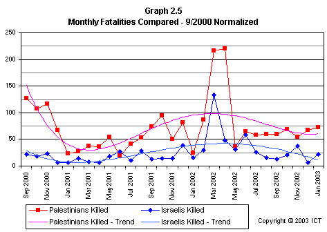 More work remains to be done in order to match the trends of fatalities with corresponding developments on the political scene. However, one can already point to several significant points: for example, a dip in Israeli fatalities in July 2001 (as a result of international pressure on the Palestinians after the June 2001 Dolphinarium attack); and sharp dips in both Palestinian and Israeli casualties in January 2002. The latter decrease in casualties corresponds to Yasser Arafat’s “cease-fire calls” to his own side on 16 December 2001.