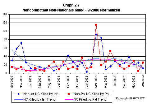 Graph 2.8 displays the overall rates of noncombatant deaths inflicted on each side by the other. It is very clear that since the end of Phase 1 of the conflict, Israeli and Palestinian noncombatant death rates have been almost identical.