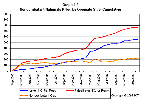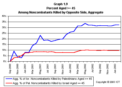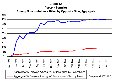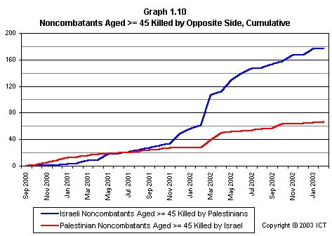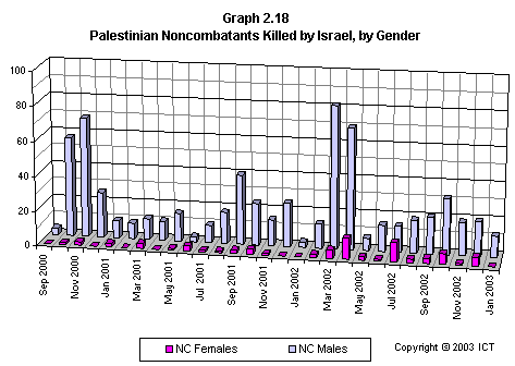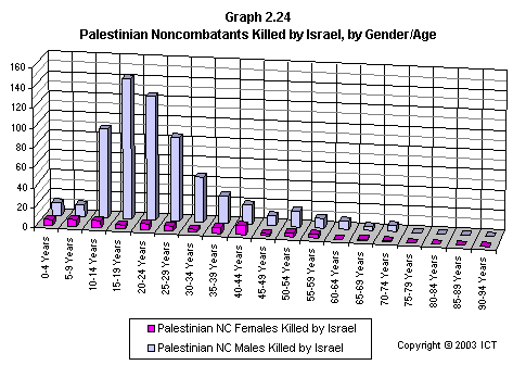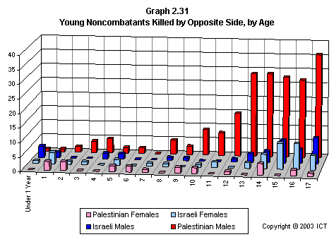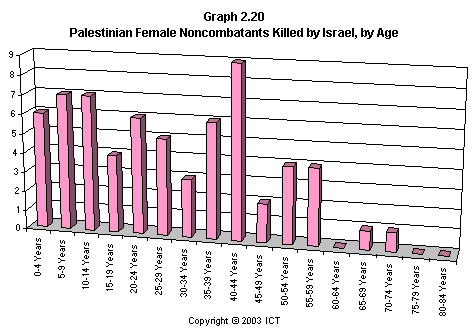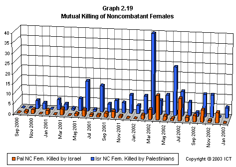 Graph 2.19 reveals a related fact that has received scant media attention: If we look only at females killed, Israeli fatalities have far outnumbered Palestinian fatalities. This graph includes only each side's noncombatant females killed by the opposite side; but even if we include Palestinian combatant females and others whose death is not reliably attributable to Israeli actions, the ratio of Israeli females killed to Palestinian females killed is 2.7 to 1. (Using the more stringent criteria of noncombatants killed by the opposite side, the ratio is 3.6 to one.)