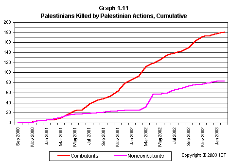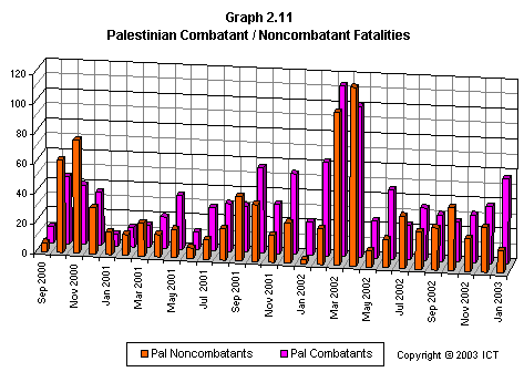 Graph 2.11 shows trends in the balance of Palestinian fatalities between combatants and noncombatants, month by month. Note that Phase 1 and the first month of Phase 3 are both characterized by surges in noncombatant deaths, while most other periods show either parity between combatants and noncombatants, or else a preponderance of combatant deaths.
