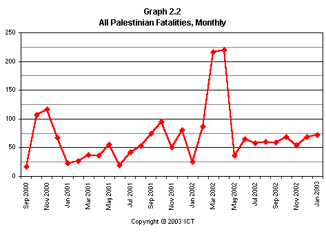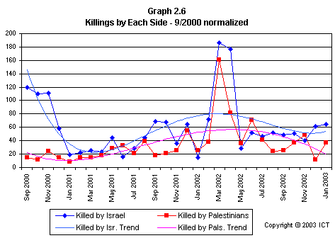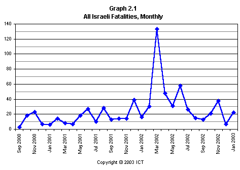 More work remains to be done in order to match the trends of fatalities with corresponding developments on the political scene. However, one can already point to several significant points: for example, a dip in Israeli fatalities in July 2001 (as a result of international pressure on the Palestinians after the June 2001 Dolphinarium attack); and sharp dips in both Palestinian and Israeli casualties in January 2002. The latter decrease in casualties corresponds to Yasser Arafat’s “cease-fire calls” to his own side on 16 December 2001.