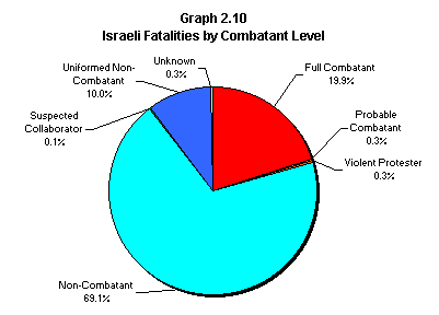 Graph 2.10 shows the equivalent distribution for Israeli fatalities. The most obvious feature of this graph is the overwhelming preponderance of noncombatants over combatants. According to our practice of classifying only Full Combatants, Probable Combatants, and Violent Protestors as combatants, about one in five Israeli fatalities have been combatants. Even were we to include such categories as civil police and soldiers aboard civilian buses (i.e. Uniformed Noncombatants) among combatants, some 70 per cent of Israelis killed have been noncombatants.