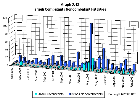 Graph 2.13 is the Israeli equivalent to Graph 2.11, showing Israeli combatant versus noncombatant fatalities.