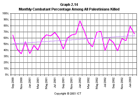 Finally, Graph 2.14 analyzes the relationship between each month's Palestinian combatant and noncombatant fatalities over time. (Compare this to Graph 1.4, which shows the cumulative trend rather than each month's ratio individually.)