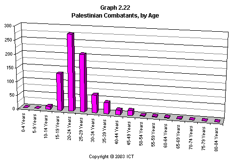 Graph 2.22 shows the age distribution of Palestinian combatant fatalities. Again, this graph shows a highly non-random distribution – but with significant differences from Graph 2.21. Palestinian combatant deaths are even more concentrated in a small age-range than Palestinian noncombatant deaths are, and combatants on average were somewhat older than noncombatants.