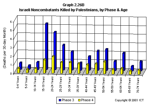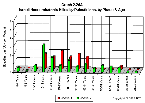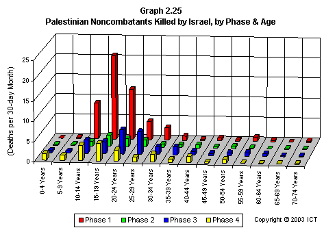 Graph 2.25 shows another interesting aspect of the age distribution of Palestinian fatalities. Here noncombatant Palestinians killed by Israel have been divided up according to the al-Aqsa conflict phases described above.