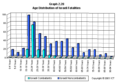 Graph 2.28 displays all Israeli fatalities by age, with combatants separated from noncombatants.