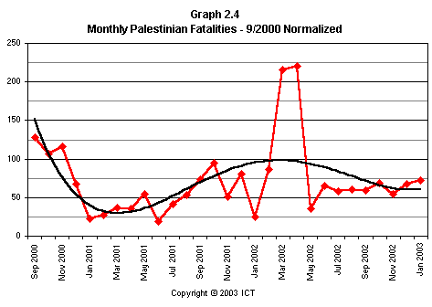 The preponderance of noncombatant over combatant casualties is immediately obvious. The irregular but generally increasing trend in Israeli noncombatant fatalities is also apparent, along with the gradual increase in Israeli combatant fatalities since the beginning of 2002, leading up to the substantial losses suffered during Operation Protective Shield. (Note also December 2001, which included several major Palestinian terrorist attacks perpetrated during American envoy Anthony Zinni’s visit to the area.) As we saw above, the extremely high number of Israeli noncombatants killed in March 2002 "flattens" the rest of the graph, making the overall increasing trend appear less significant than it otherwise would.