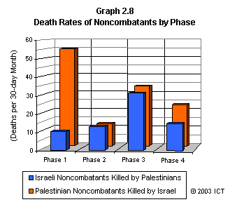 Graph 2.8 displays the overall rates of noncombatant deaths inflicted on each side by the other. It is very clear that since the end of Phase 1 of the conflict, Israeli and Palestinian noncombatant death rates have been almost identical.